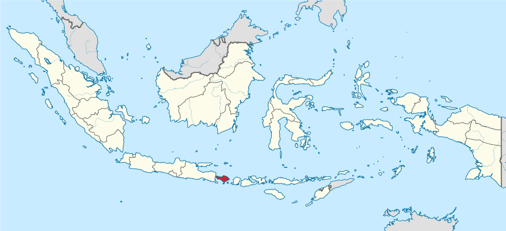 The island of Bali is situated in the Lesser Sunda Islands, Indonesia. It lies 1 mile (1.6 km) east of the island of Java, separated by the narrow Bali Strait.