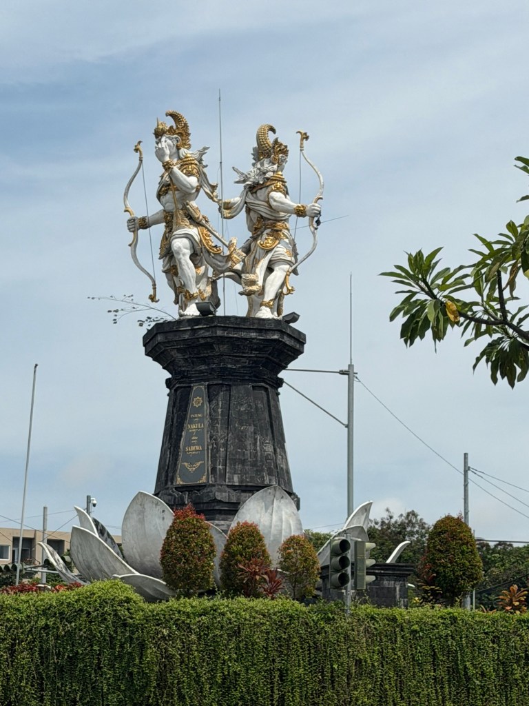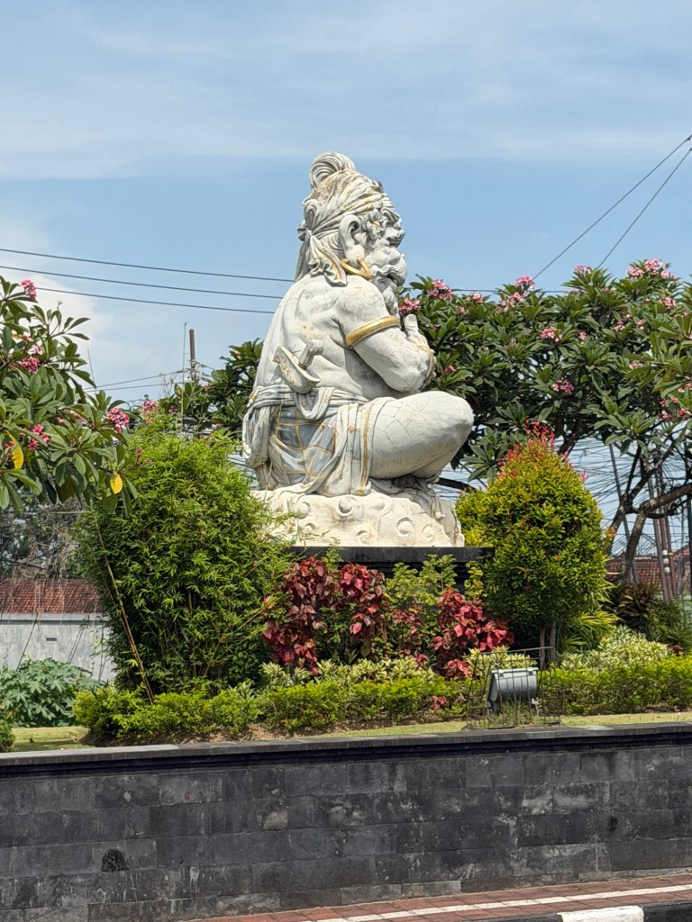 This is Dewi Sarasvati, the Goddess of Knowledge, revered in Balinese Hinduism as the shakti, the feminine creative energy of Brahma, the Creator of the Universe. She embodies wisdom and learning within the cosmic cycles of Tri Kona – Utpi (Creation), Stiti (Preservation), and Pralini (Dissolution) – which correspond to the trinity of Tri Murti: Brahma the Creator, Vishnu the Preserver, and Shiva the Destroyer.