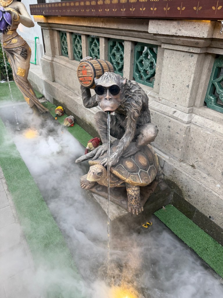 This installation represents a scene from the Kishkinda Kanda, one of the Saptakanda (seven chapters) of the Ramayana. It depicts Vali, one of the mighty vanara kings of Kishkindha defeating Mahishasura, the buffalo-headed-giant, after a plea from the gods for Vali to restore order and reclaim the honour of Kishkindha.