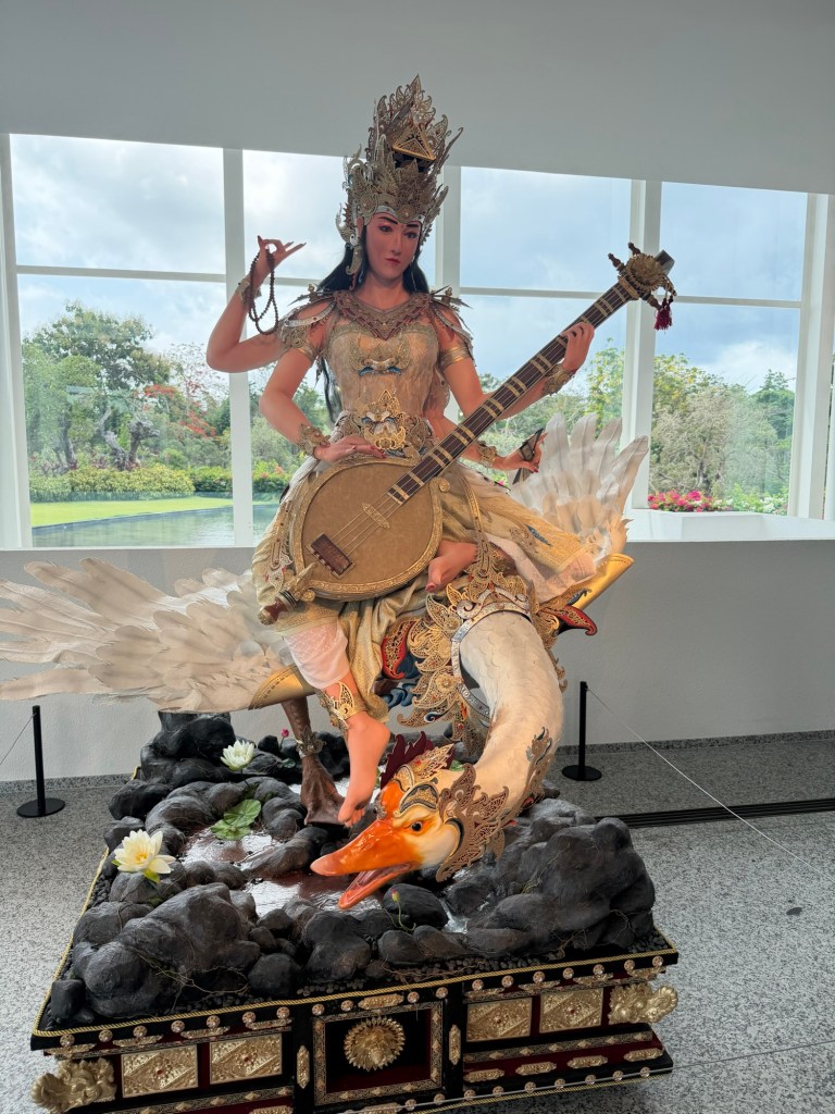 Sarasvati holds a rebab, a stringed instrument that symbolises the harmony of wisdom manifested in the arts.